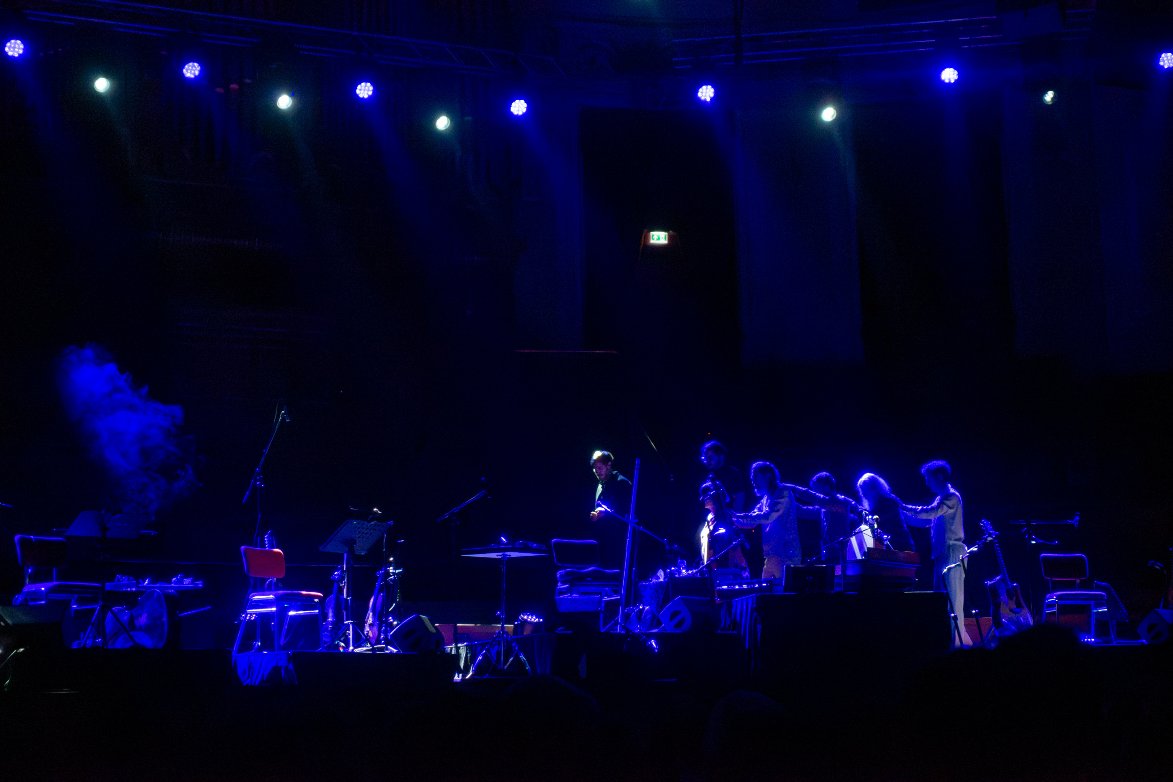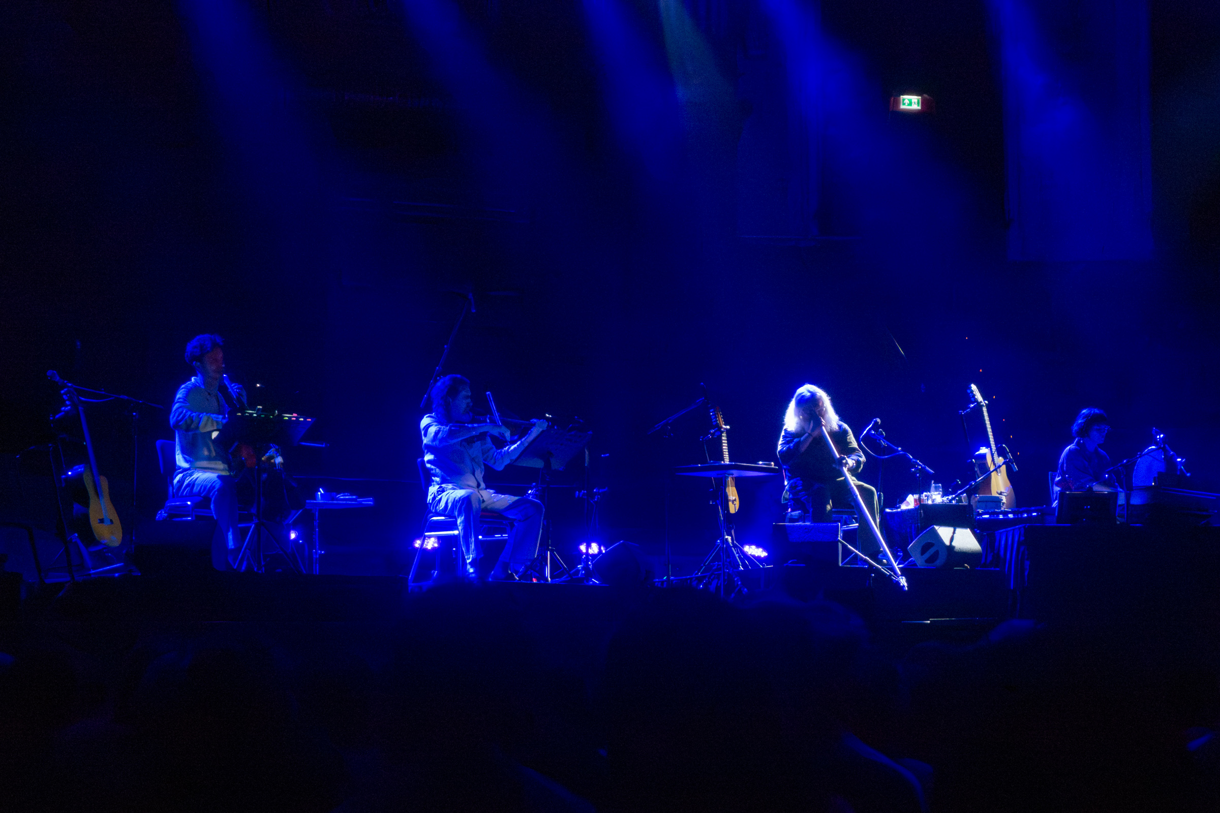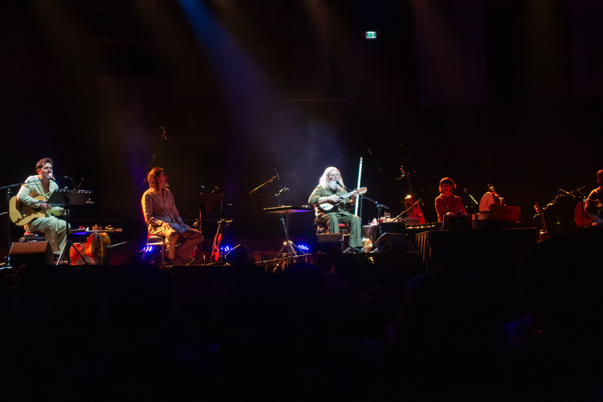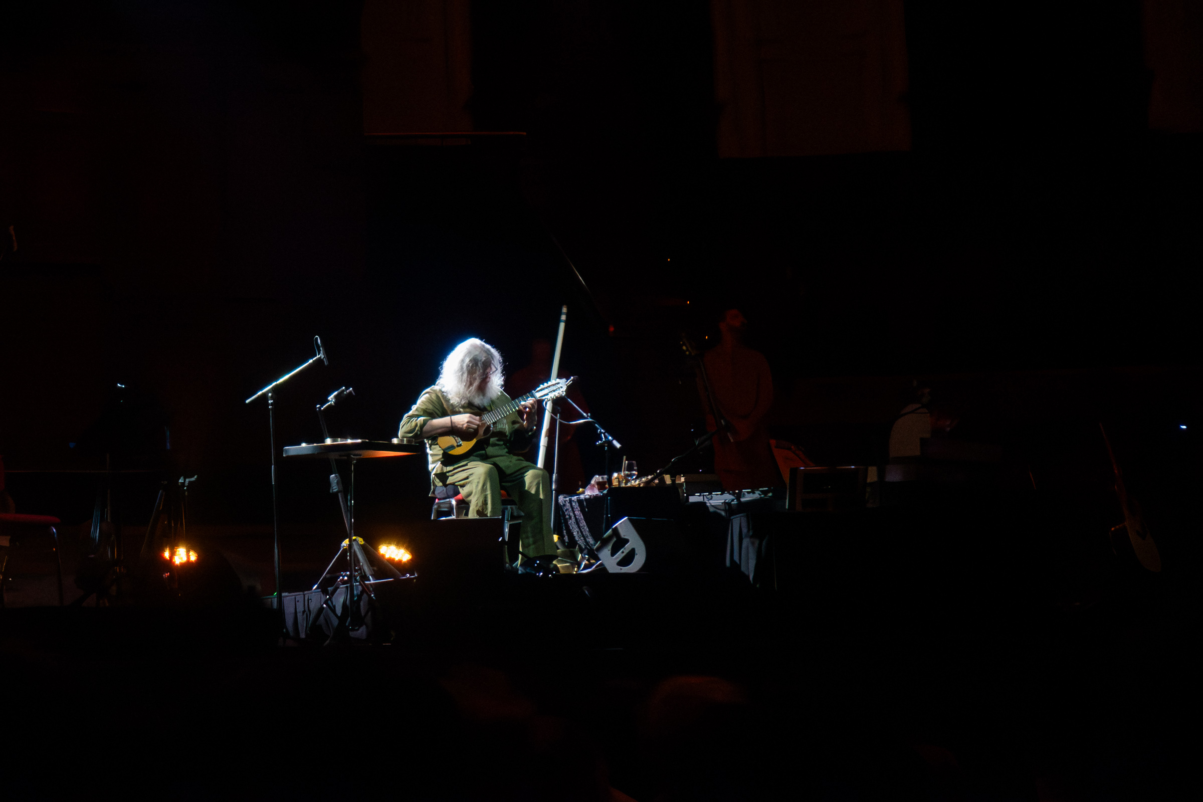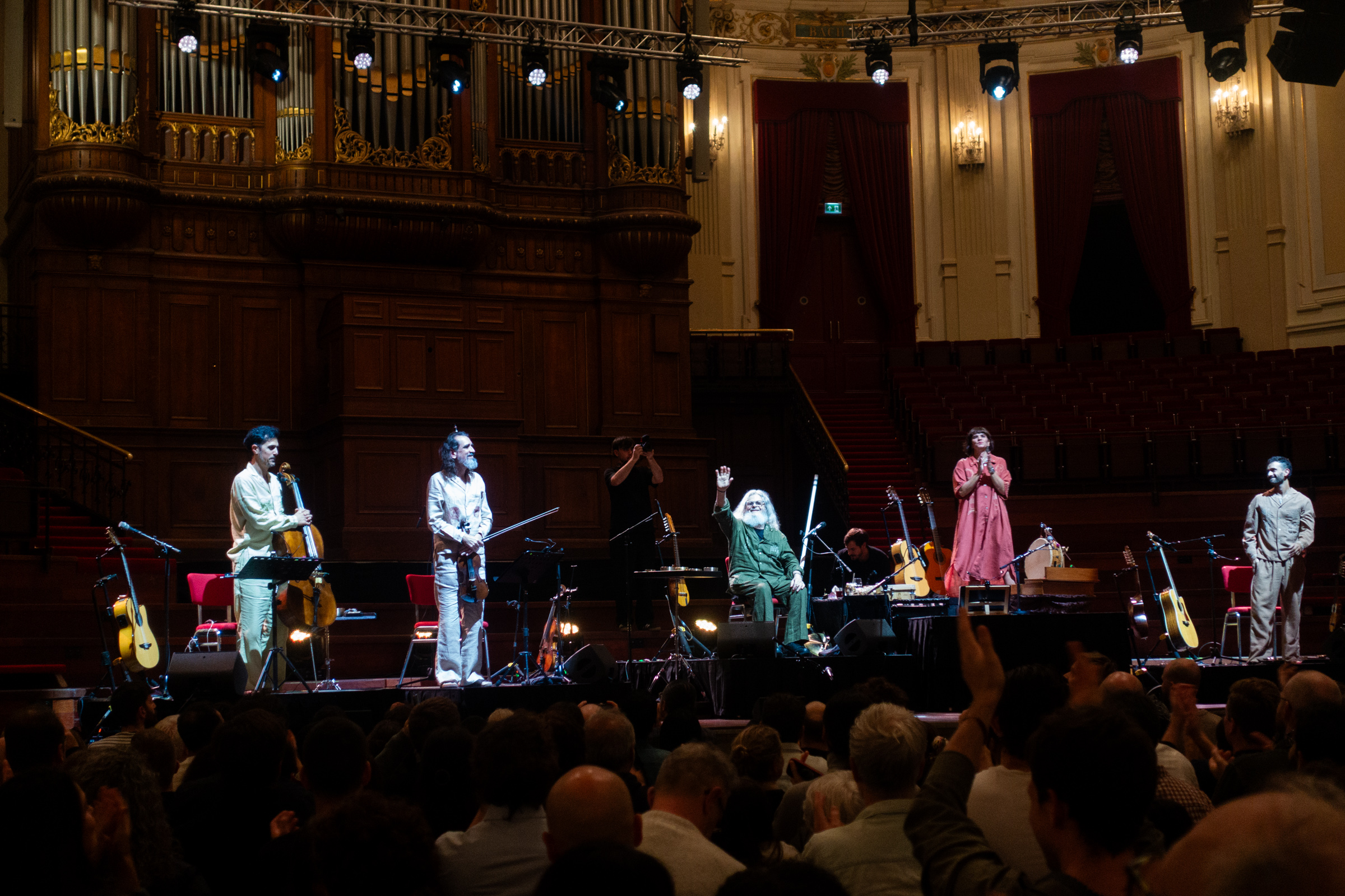 Many people who give concerts in Het Concertgebouw love to enter the stage by using the doors in the back and walk down the famous red stairs, while also being greeted with applause from the audience. Unfortunately Santaolalla lost the ability to walk by himself, and a wonderful solution has been found to solve this challenge. The stage was almost dark and we could listen to rain drops, on which the musicians slowly walked as a human train onto the stage from the side, with Santaolalla in the middle being gracefully transported to his seat in the middle. After sitting down, his fellow musicians stood back and Santaolalla started to play on singing bowls by himself. Halfway the piece the rest also sat down and joined in. These musicians were from his inner circle he has been collaborating with for quite a while. They were Nicolás Rainone, who played cello and acoustic bass guitar, Javier Casalla on violin, Barbarita Palacios, who sat on the floor of her little stage playing all kinds of percussion instruments, keys and guitars, and lastly Juan Luqui on additional guitar, roncoco and charango.